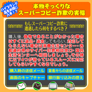 購入後にスーパーコピーの商品であることがわかった場合は、すみやかに返品し支払ったお金を返してもらいましょう。